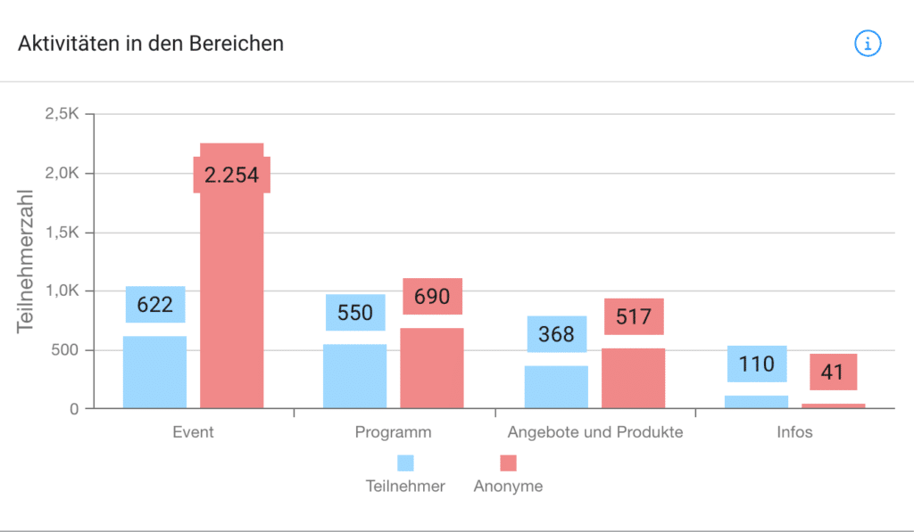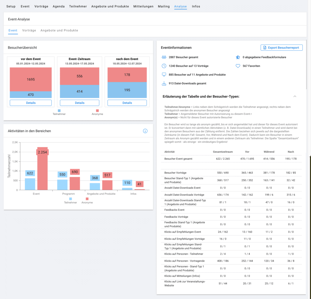 - Event: Eine hohe Aktivität im gesamten Eventbereich zeigt, dass das Event insgesamt gut besucht und interaktiv war. Dies ist ein Indikator für das allgemeine Interesse und die Attraktivität der Veranstaltung.