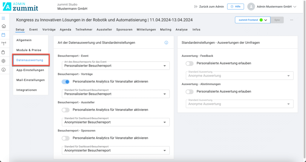 Nach der Aktivierung des Analysemoduls finden Sie im Setup-Bereich einen neuen Reiter mit dem Titel Datenauswertung. Hier können Sie die Art der Besucherreports für verschiedene Eventkomponenten einstellen. Es werden immer nur die Inhalte angezeigt, die sie unter Event-Analyse auch aktiviert haben.