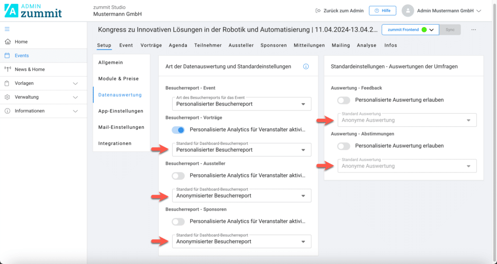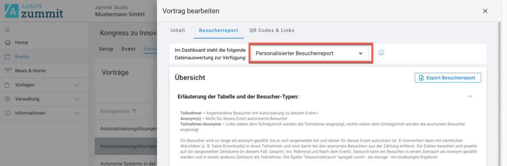 Spezifische Analyseeinstellungen: Wählen Sie den gewünschten Vortrag oder Stand aus und navigieren Sie zur Option ‚Besucherreport‘. Hier können Sie spezifisch für diesen Inhalt entscheiden, ob der Report anonym oder personalisiert sein soll.