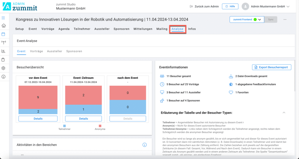 - Detaillierte Reports: Für vertiefte Einsichten stehen separate Reports für Vorträge, Aussteller und Sponsoren zur Verfügung. Diese berücksichtigen individuelle Aktivitäten und Interaktionen innerhalb jeder dieser Entitäten.