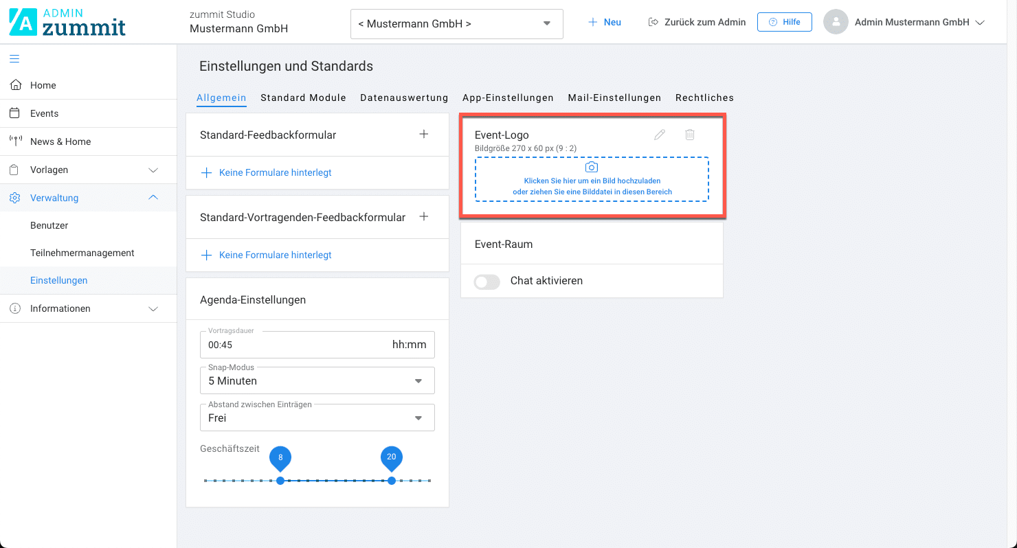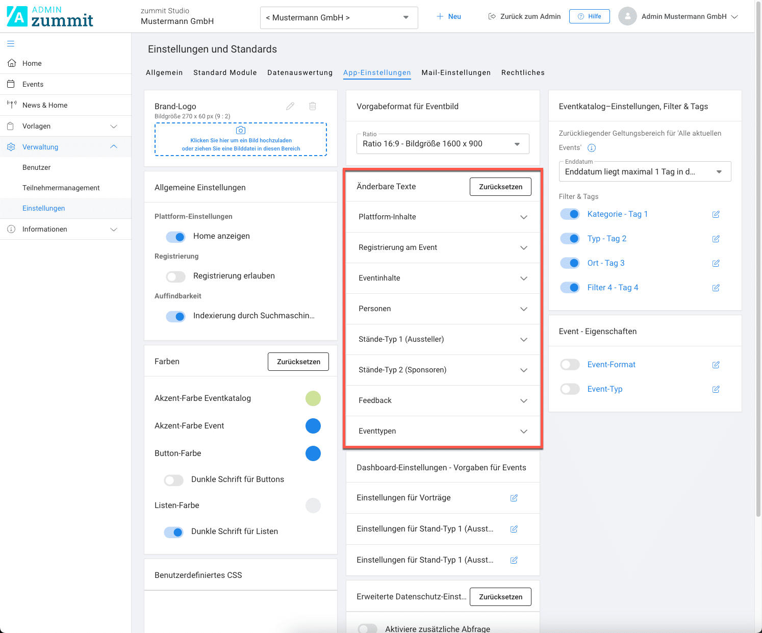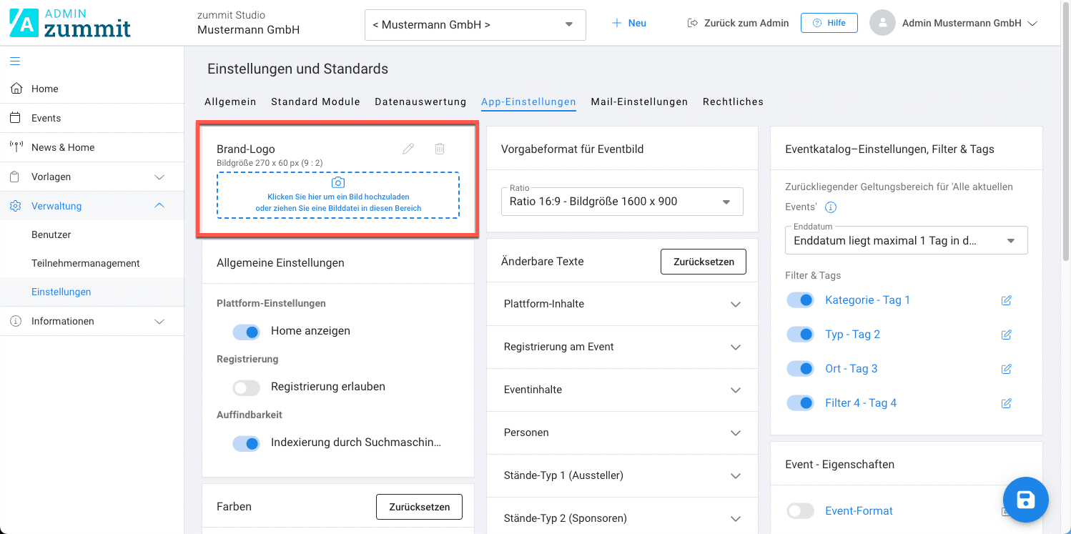 Die Möglichkeit, das Erscheinungsbild Ihrer Event-Plattform anzupassen, finden Sie in den App-Einstellungen innerhalb des Verwaltungsbereichs. Diese Einstellungen bieten Ihnen die Werkzeuge, um eine nahtlose und kohärente Markenidentität über alle Ihre digitalen Touchpoints zu gewährleisten.