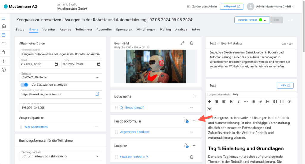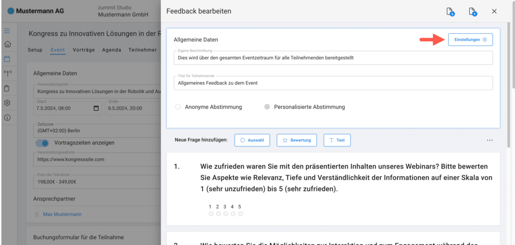 Feedbackformulare sind ein leistungsstarkes Werkzeug, um wertvolle Rückmeldungen von Teilnehmenden zu sammeln und die Qualität Ihrer Veranstaltungen kontinuierlich zu verbessern. In diesem Guide erfahren Sie, wie Sie Feedbackformulare erstellen, anpassen und in Ihrem Event, Vorträgen oder bei Stand-Typen integrieren können.